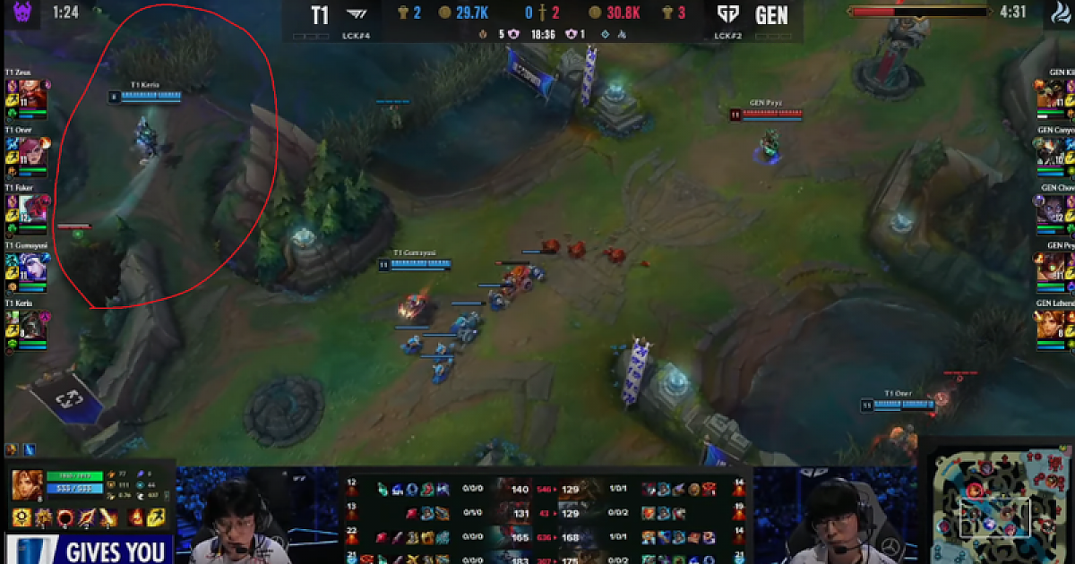 이로 인해 젠지도 T1의 바론 러쉬를 계속 의식하고 있었다곤 하지만 시야적 근거를 잃게 되어 T1이 1경기 분기점이 되는 바론 사냥에 성공하는 포석이 됩니다.