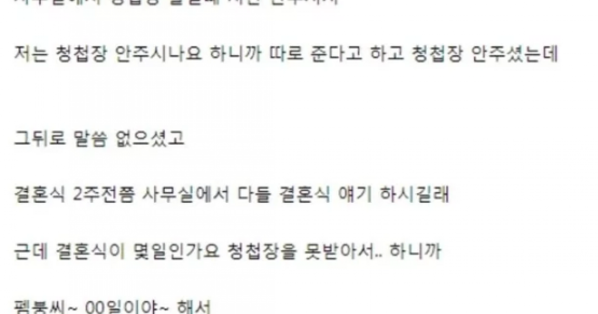 사수 결혼식에 안갔습니다 누구잘못이죠 킬링타임 유머 0 4 0 2024.03.18 20:22 링크복사 이렇게 마지막 얘기 끝나고 계속 냉전중인데 솔직히 잘 모르겠습니다 저도 억울한 부분이 있긴한데 제가 크게 실수 한 것 같습니다 다시 제가 사과 드려야 할까요? 링크복사 0 킬링타임 0 0