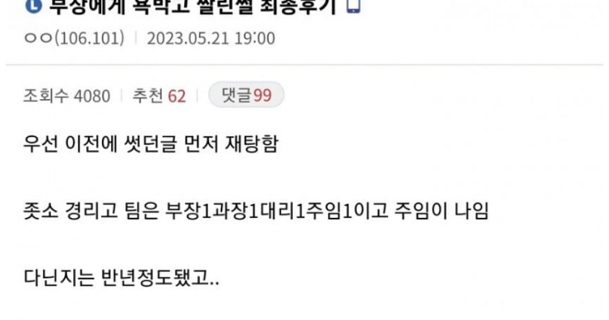 부장한테 욕 박고 짤린 썰 킬링타임 유머 0 5 0 2024.03.14 21:18 링크복사 부장은 그래도 악착같이 남아있는거 꼴받네 ㅋㅋㅋㅋㅋㅋㅋ 아 부장 있을때 작업하면서 혼잣말로 욕 해야 하는데 ㅋㅋㅋㅋㅋㅋㅋ 부장을 만나자.. 링크복사 0 킬링타임 0 0