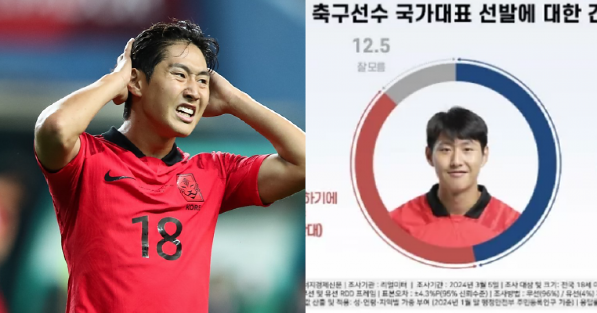 이강인(22·PSG)이 국가대표팀 내에서 논란의 중심에 선 상황에서도, 여론 조사 결과는 그의 계속된 국가대표팀 선발을 지지하는 쪽이 반대보다 높은 것으로 나타났습니다. 에너지경제신문이 리얼미터를 통해 실시한 조사에 따르면, 526명을 대상으로 조사한 결과, 이강인의 국가대표팀 선발에 긍정적인 의견을 내놓은 참여자의 비율은 46.9%였습니다.