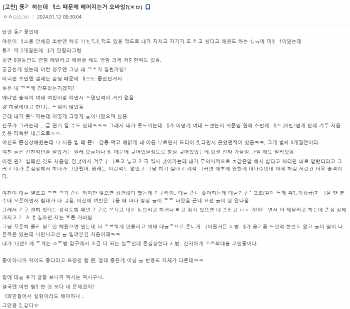 ㅁ많고 ㅂㅈ가 항상 ㅈ어있었던 여친이 안 ㄷ줘서 고민인 남자