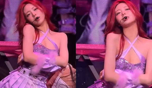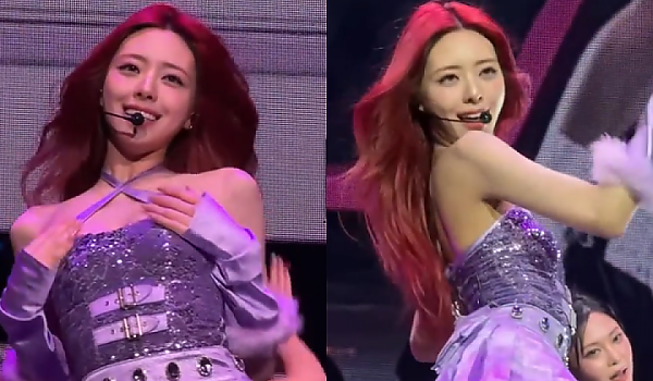 보라빛 숏 원피스 입고 무대 선 ITZY 유나.gif