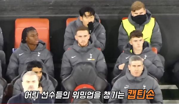 벤치에 앉아 있을 때에도 주장의 품격을 보여주는 손흥민.gif