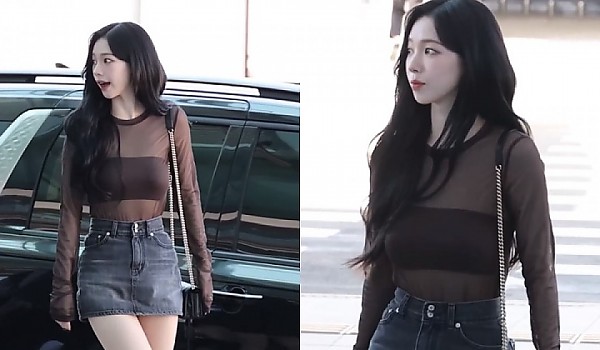 남다른 분위기를 뽐내며 시스루 + 청치마 입은 공항패션의 완성 에스파 '카리나'ㄷㄷ.gif