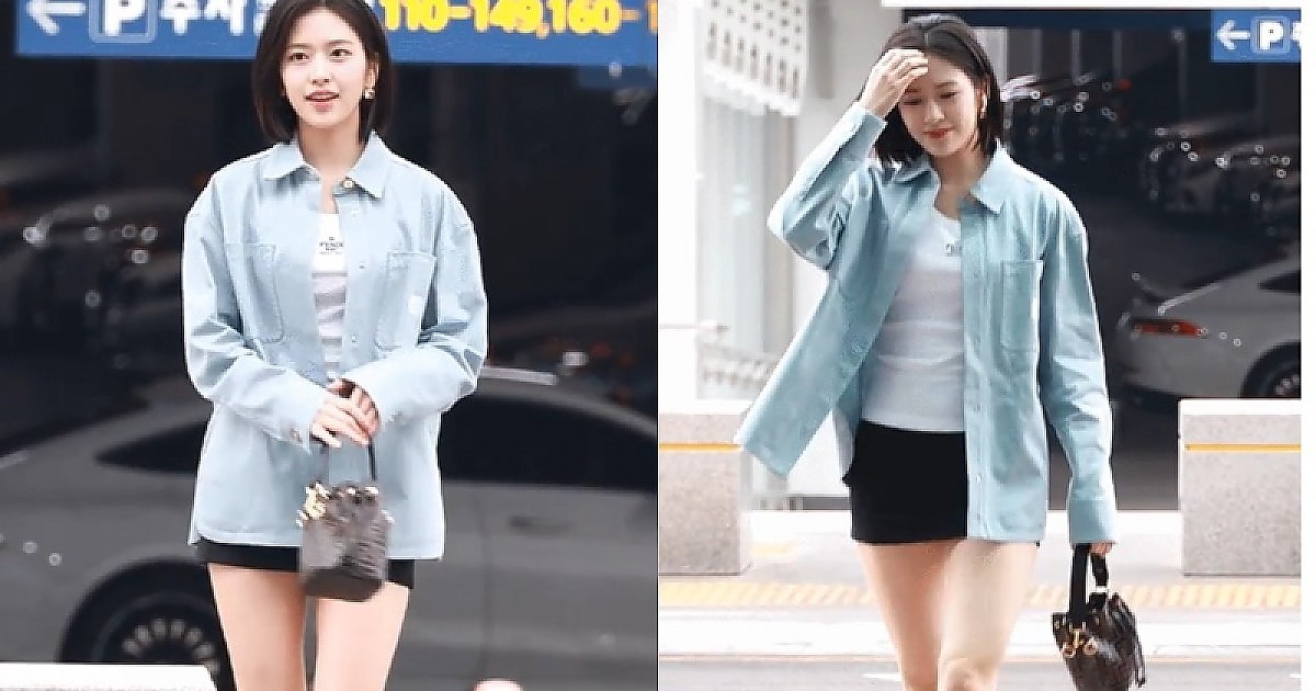 공항에 걸어들어오면서 머리를 쓰다넘기는 각선미 넘치는 아이브 '안유진'