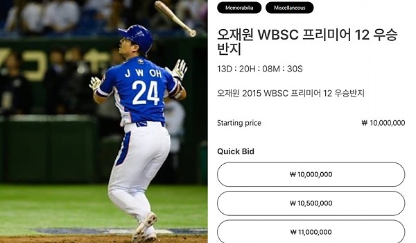 역사상 최고의 빠던 오재원, 제 1회 프리미어12 우승반지가 경매장에?···급전 필요한가 …