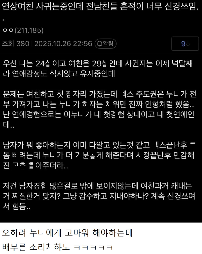 연상 여친 사귀는중인데 ㄸ칠때 전남친들 흔적이 너무 신경 쓰여