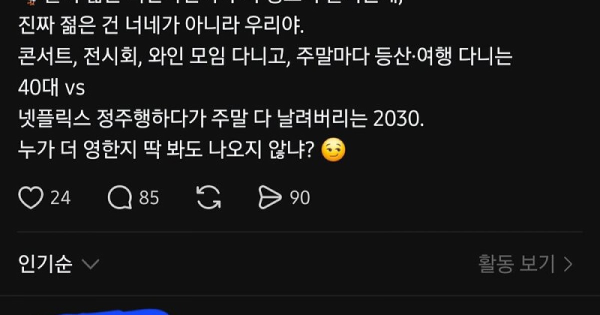 최근 인스타 스레드에서 핫했던 영포티와 2030 갈등 주제에