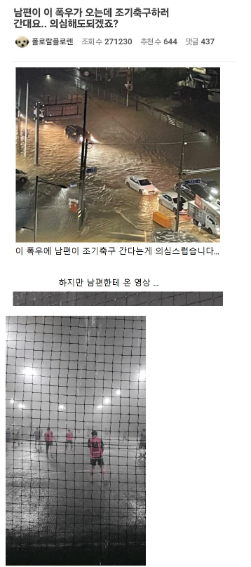 이 폭우에 남편이 조기축구 간다는게 의심스러워서..