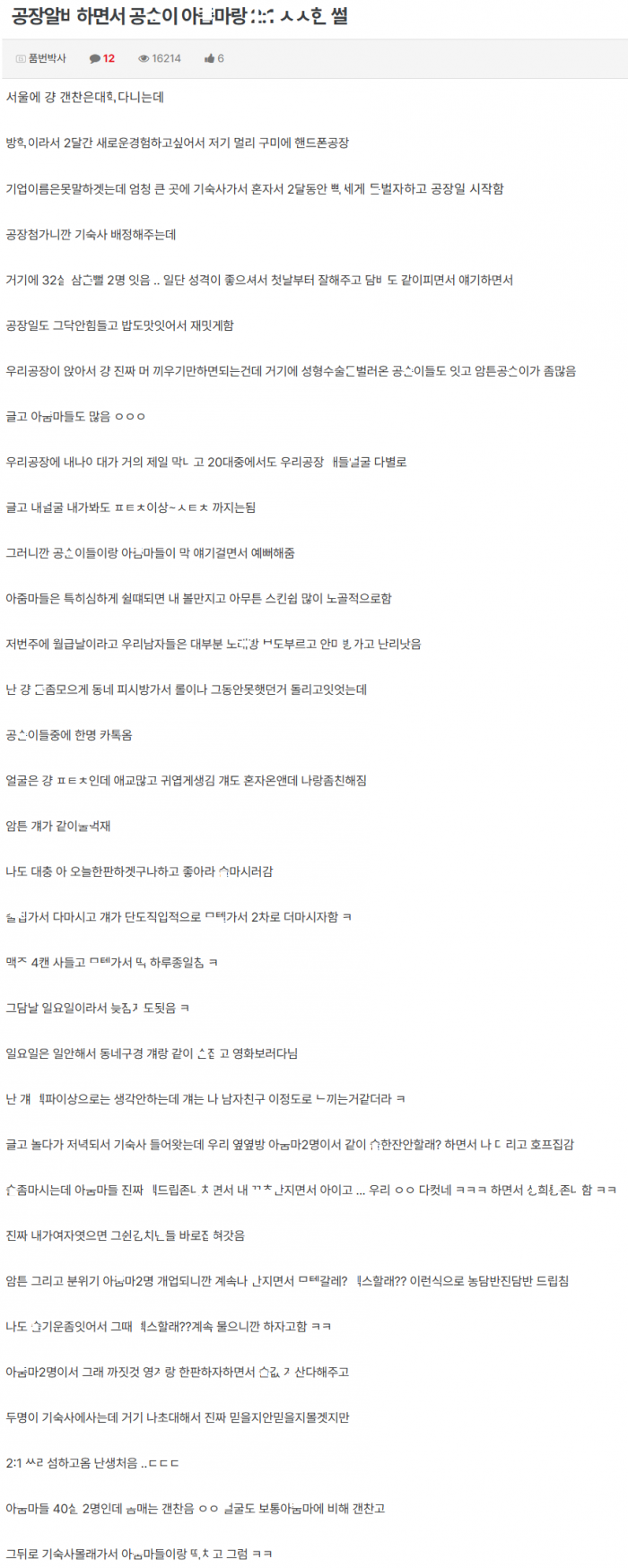 공장에서 일하면서 공순이 아ㅈ마들이랑 쓰ㄹㅆ한 썰