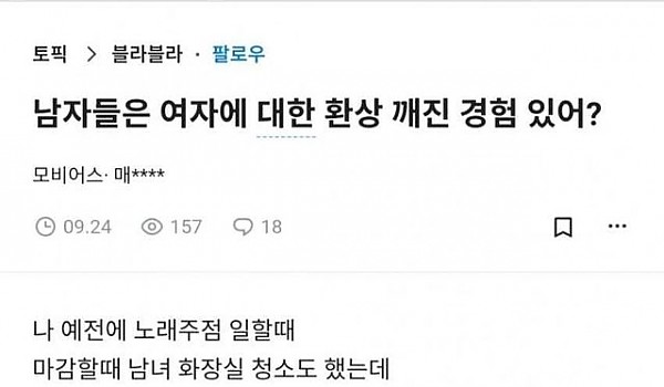 형냐들 여자에 대한 환상깨진 경험있오?