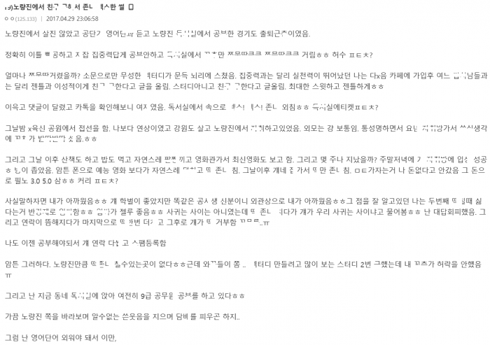 노량진에서 공ㅂ 친ㄱ 구ㅎ서 ㅈㄴ ㅅㅅ터디한 썰