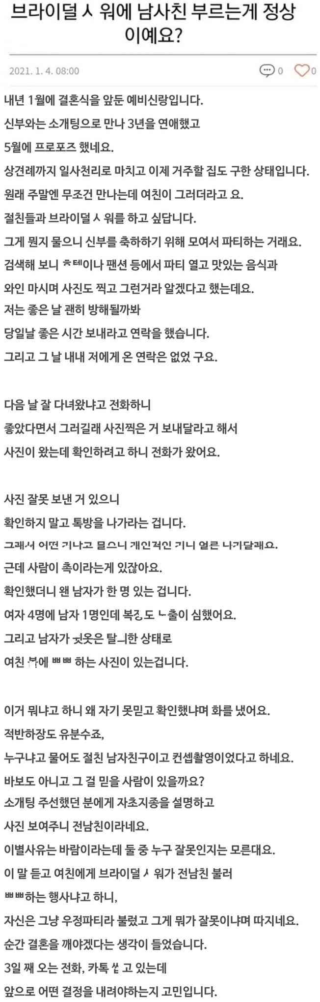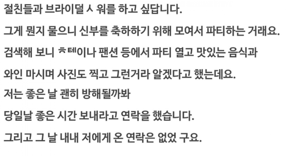 결혼 앞두고 브라이덜 샤ㅇ에 남사친 부른 여친