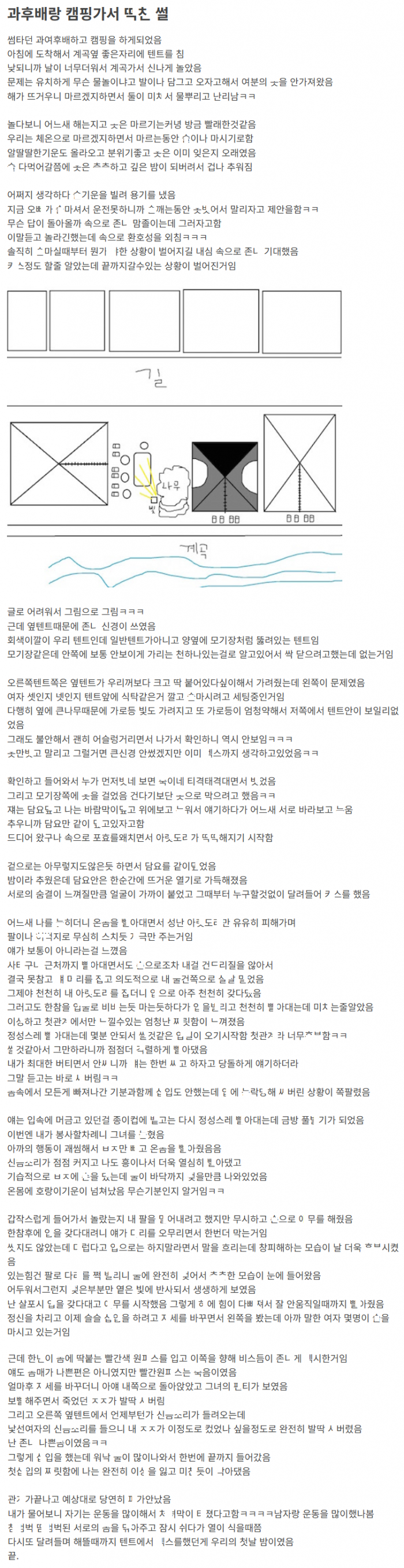 과후배와 캠핑 가서 ㅈㅈ를 ㅂㅈ에 ㄴ고 ㅂ아댄 이야기